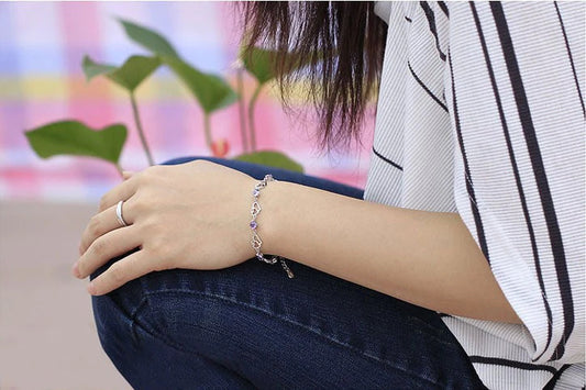 Silver Platinum Purple Zircon Heart Elegant Ladies Bangle Bracelet