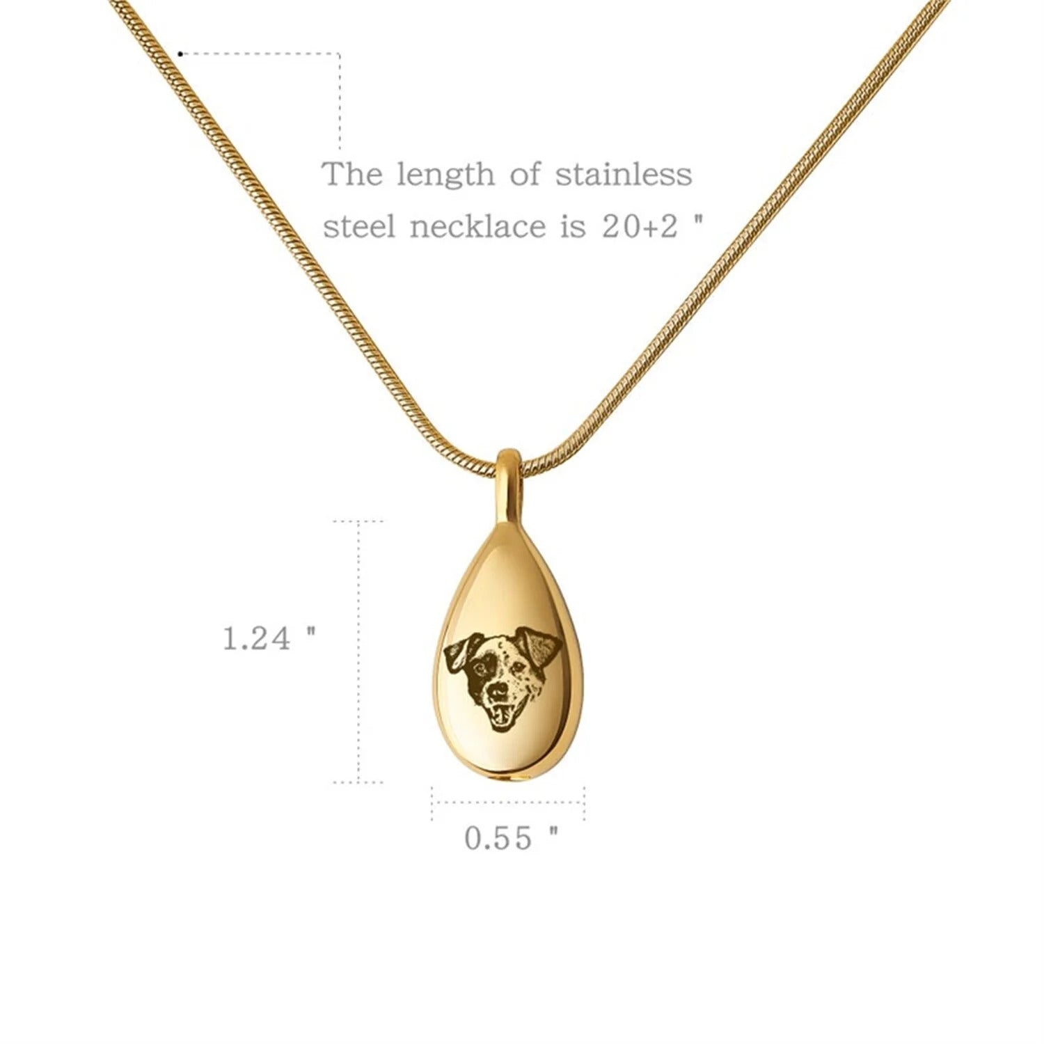 Pet Photo Urn Necklace - Pet Ashes Jewelry - Pet Portrait Custom - Pet Ashes Keepsake - Dog Photo Urn Necklace Cremation Jewelry Pendant Size: 2-5cm*3-10mm Material: Stainless Steel Color: Gold/Silver/Rosegold Max letters: Max 8 letters per name